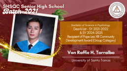 Our SHSians are deeply committed to living out the values of Truth in Love by actively serving through the School of the Holy Spirit Quezon City Alumni Association (SHSQCAA). This commitment is reflected in their dedication to giving back to the school community that shaped them, ensuring that the spirit of SHSQC continues to flourish. Through their involvement in SHSQCAA, they embody the principles of service, compassion, and leadership, striving to make a positive impact both within the school and beyond. By spreading Truth in Love, our alumni serve as role models, inspiring current and future students to uphold these values in all aspects of their lives.